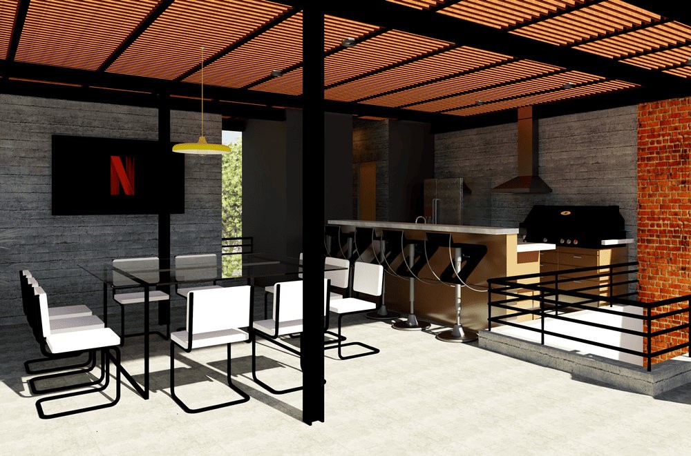 A área gourmet, projetada para ser o epicentro das interações sociais, conta com uma bancada generosa, churrasqueira, forno de pizza e espaço de estar integrado. Grandes aberturas garantem a ventilação cruzada e permitem que a natureza dialogue com o interior, criando um ambiente dinâmico e agradável para encontros que atravessam o dia e adentram a noite.