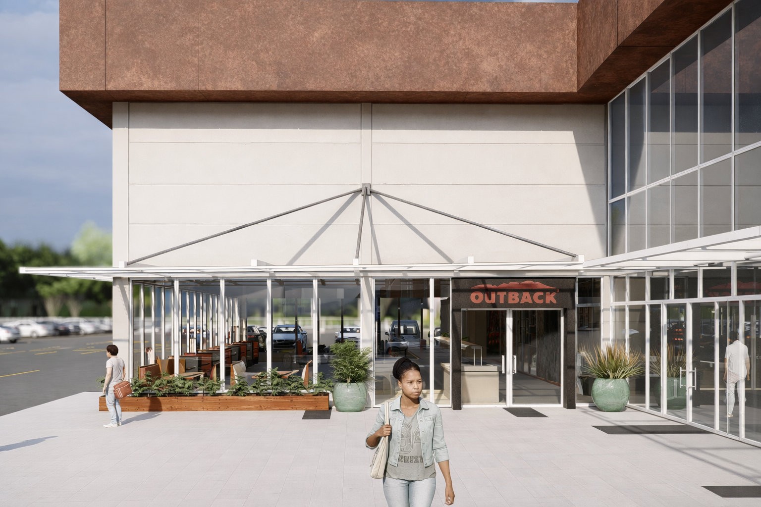 Por se tratar de um projeto comercial de alto fluxo, a escolha dos materiais foi essencial para garantir leveza, durabilidade e identidade visual. O uso expressivo do vidro permite uma conexão fluida entre o interior e o exterior, valorizando a iluminação natural e ampliando a percepção do espaço. Já o metal, com sua estética industrial e robustez, confere à estrutura um caráter contemporâneo, alinhado à linguagem arquitetônica da marca Outback e à dinâmica de um shopping center moderno.