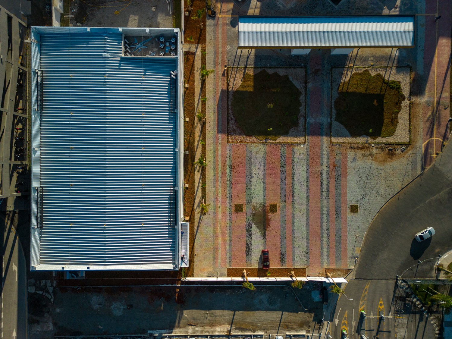 Essa volumetria se funde com o paisagismo presente no local, caracterizado por árvores com grandes copas (nos seus futuros crescimentos) para criação de áreas de sombras para futuro uso público, tornando a praça um ponto de convívio.